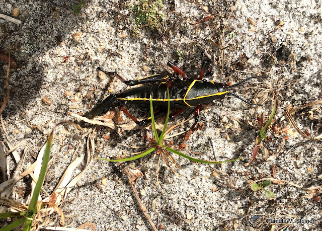 I found the culprit (actually, I found 3 of these ugly young Eastern Lubber Grasshoppers on or around my amaryllis plants...one of their favorite foods.