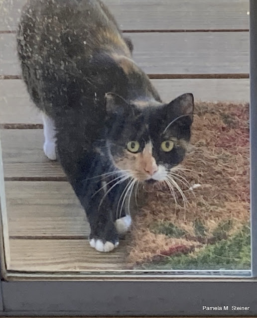 Someone else came by for a visit...this neighborhood pretty calico kitty appeared at our back door on the back porch all of a sudden: